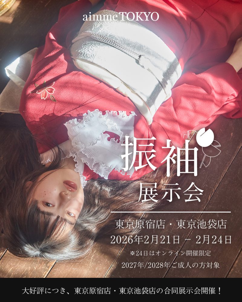 2027年(令和9年)、2028年(令和10年)新成人の皆様お待たせいたしました! 毎年大好評をいただいております、年に一度の祭典 aimme3店舗(原宿店/池袋店/札幌店)にて振袖展示会の開催が決定いたしました! また、告知と同時に本日よりご予約エントリー開始いたします♩