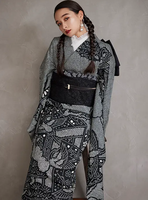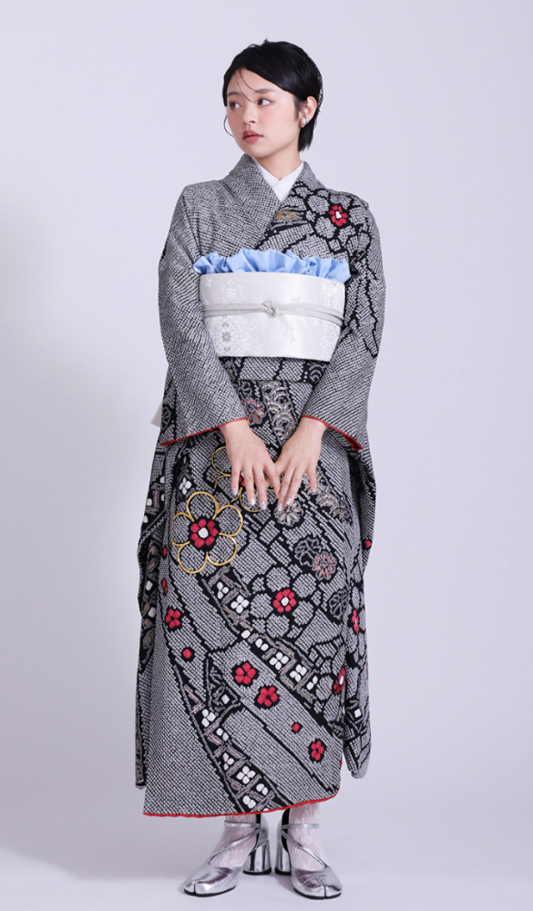 黒ベースの総絞り振袖にブラックレースの帯を使用した上品さの残るガーリーなスタイリング。