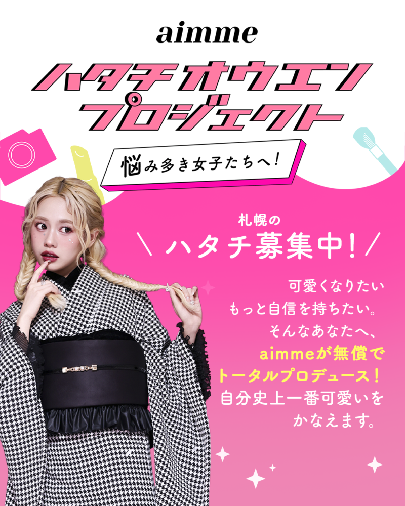 「振袖モデルなんて、私には無理…」 そう思っているあなたへ。 aimme札幌店では、悩みや不安を抱える等身大の女の子を プロの技術でプロデュースする**「ハタチ応援プロジェクト」のモニターメンバー**を 大募集しています!📸