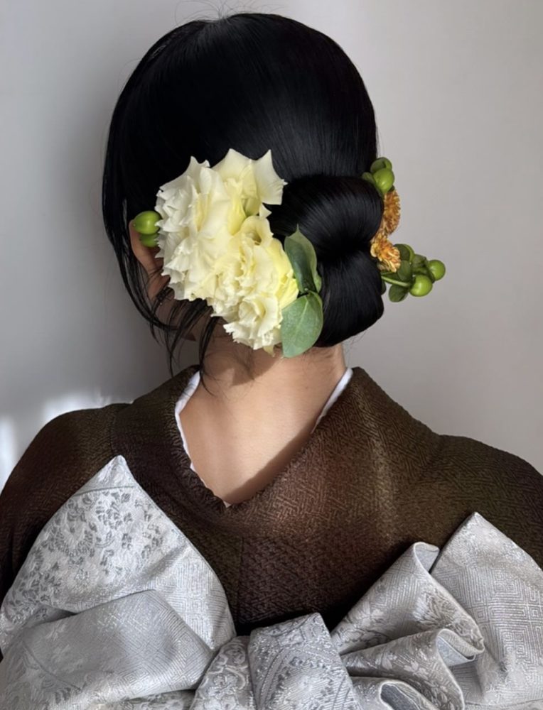 シンプルかつ上品な印象に仕上がるタイトシニヨンに生花をアレンジしたスタイルも