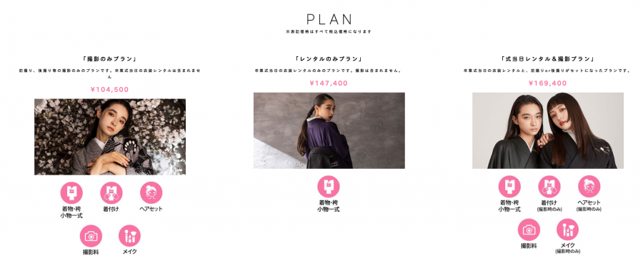 卒業式当日の衣装レンタルと、前撮りor後撮りがセットになったプランです。