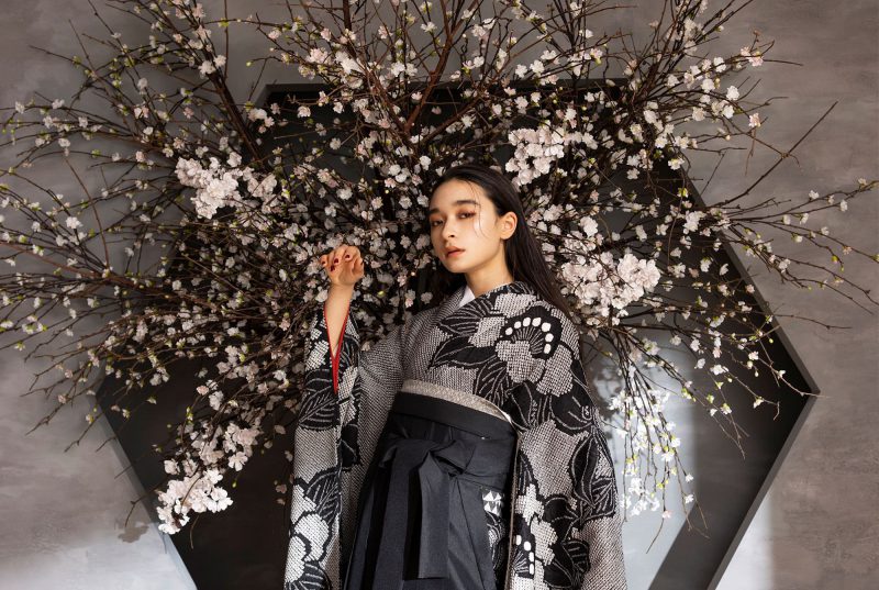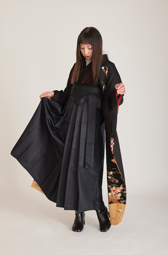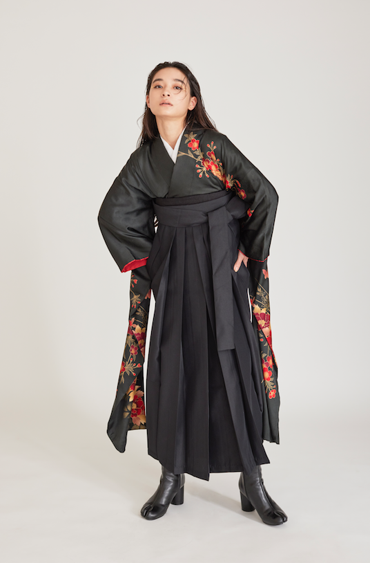 黒に赤の花模様がおしゃれでガーリーな振袖に黒袴を合わせるモードなスタイリング。