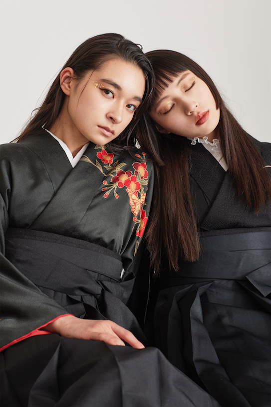 handsome×girly今回のスタイルはシンプルにモードな雰囲気なテイストです。ちょっと大人な雰囲気が袴スタイルの新しいスタイルです。メイクは金箔がアクセントになっていて他にないおしゃれなスタイルに仕上げています。