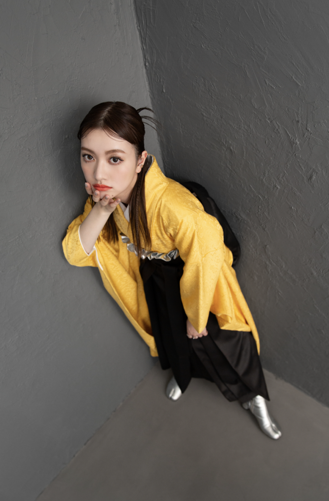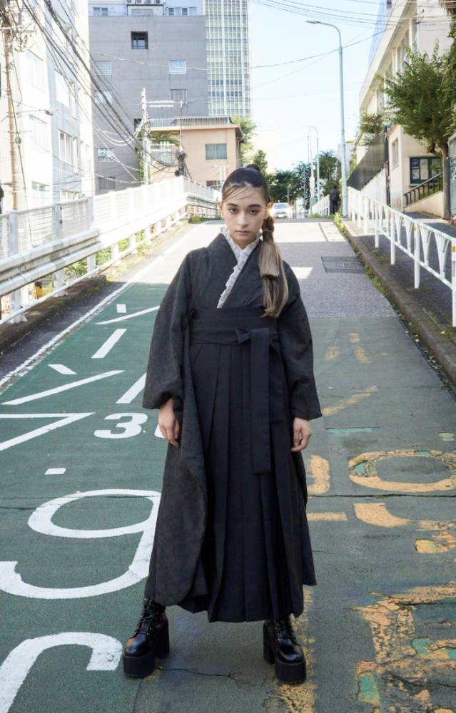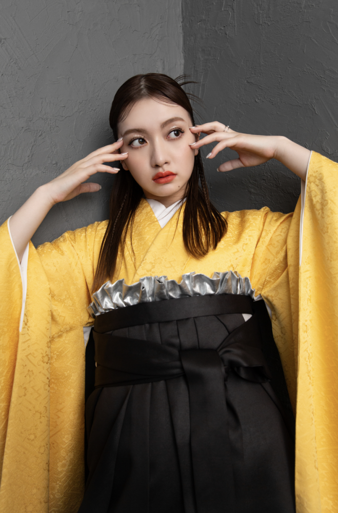 形からオリジナルで作成をしたバイカラーのオリジナル振袖と袴を合わせたガーリーなスタイリング。