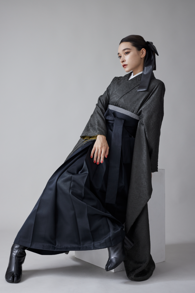 大人気の墨鶯の振袖と黒袴を合わせたシンプルかつクールな印象のスタイリング。