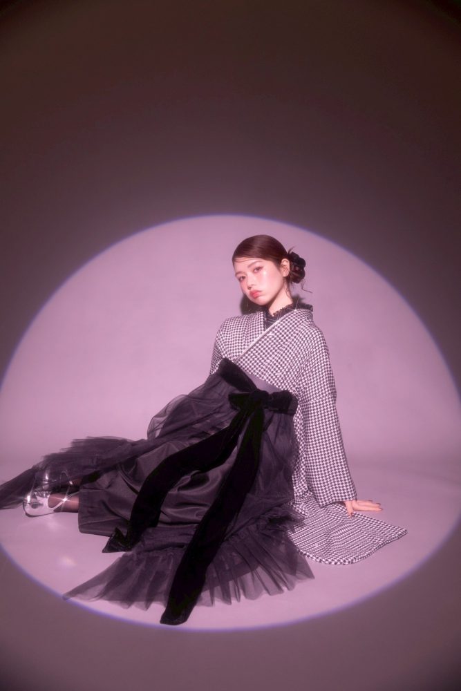 千鳥格子柄の着物に、ブラックのチュール袴を合わせた抜け感のあるスタイル。