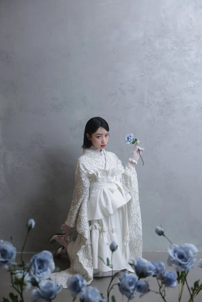 レース素材の着物と、フリルをあしらった袴を組み合わせた、圧倒的な透明感。