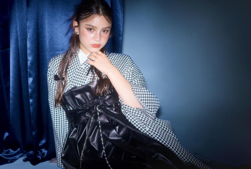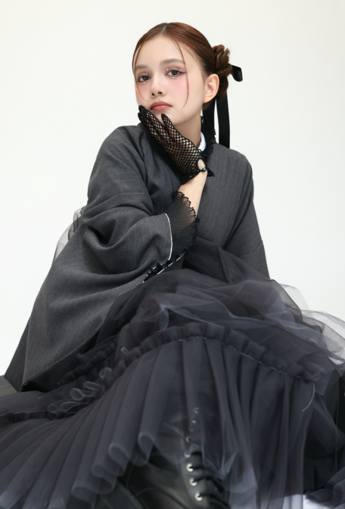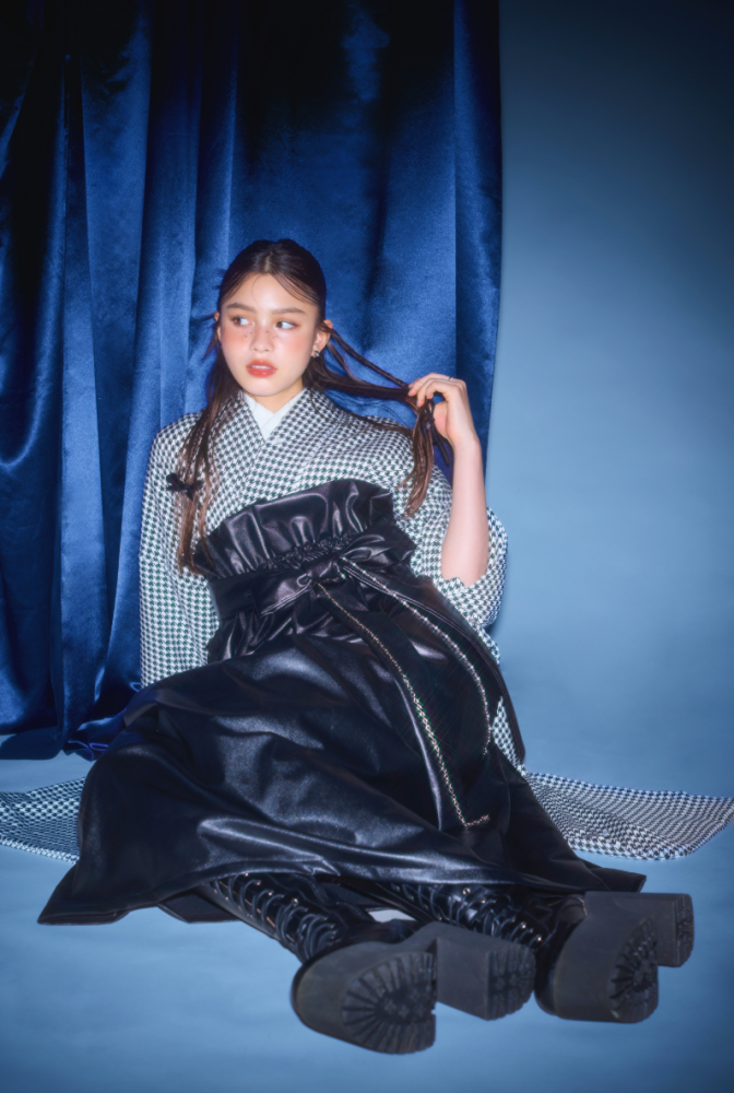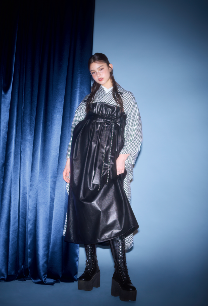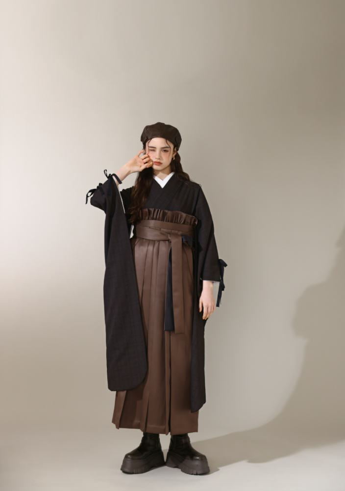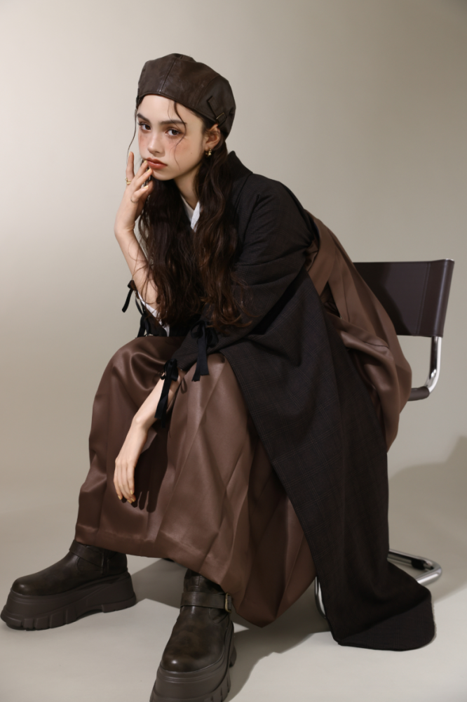 オリジナルアイテムのチュール袴を組み合わせ、ダークトーンでまとめた大人ガーリーコーデ。