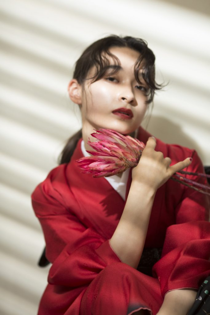 目元とリップは赤を使用し和装らしい雰囲気に仕上げたメイク。目元の赤に抵抗がある方はリップだけでもぐっと和の雰囲気になりますよ!