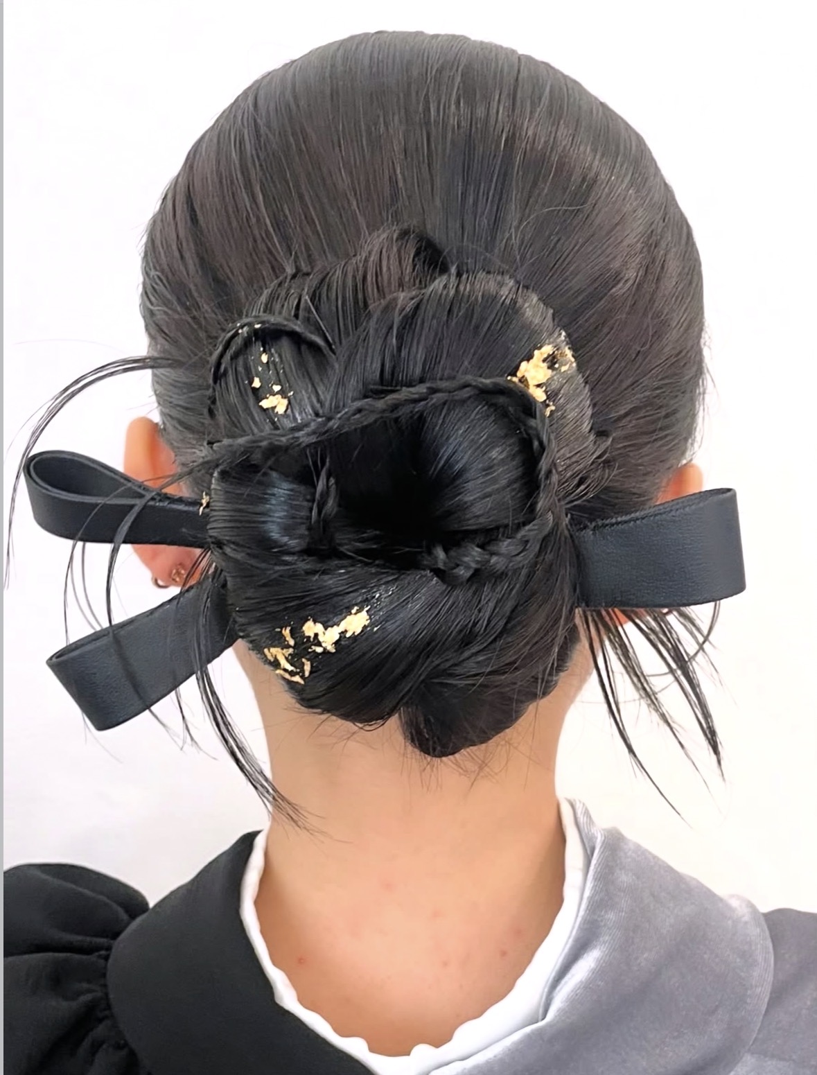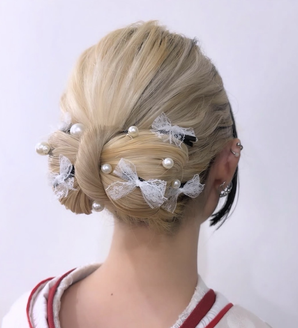 後にストーンで上品さを出しつつアレンジでガーリーさを引き立たせるヘアスタイル。ピッタとしたシルエットですがリボンやねじりなどのアレンジを加えるのもおすすめです。
