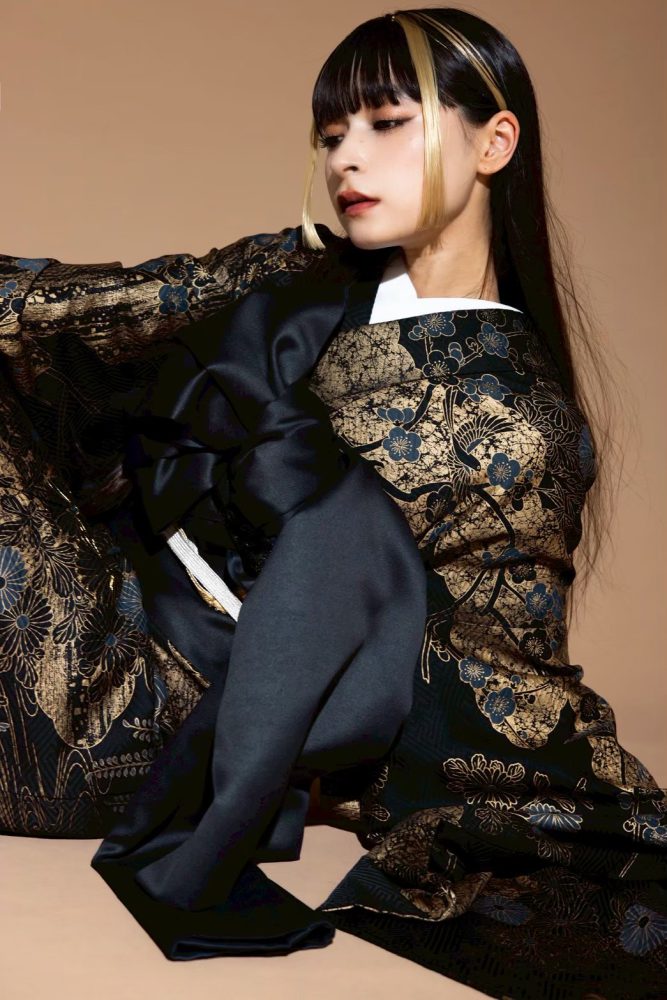 シックなネイビーペーパーが引き立つ黒染め振袖が最高にクールなビジュアル