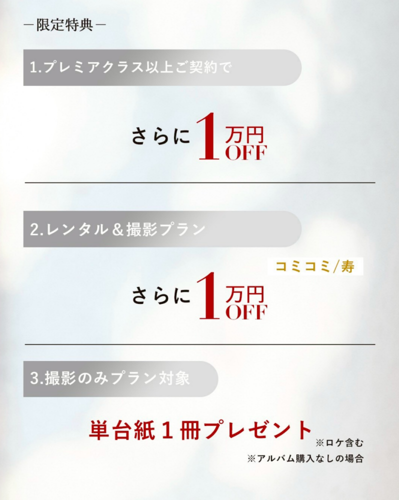 重ね襟OP無料 /コーディネートOP50%OFF /土日祝日撮影料金無料 /集合撮影無料 /ドレス1着撮影サービス