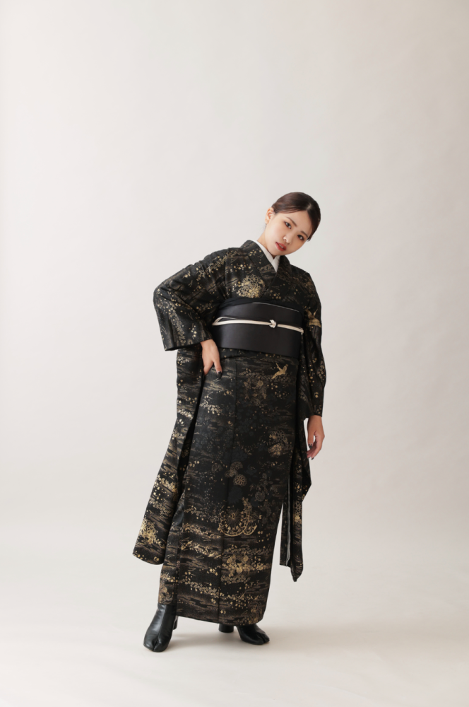 伝統的な黒振袖を、足袋ブーツとシンプルな帯使いでモダンにアップデート。