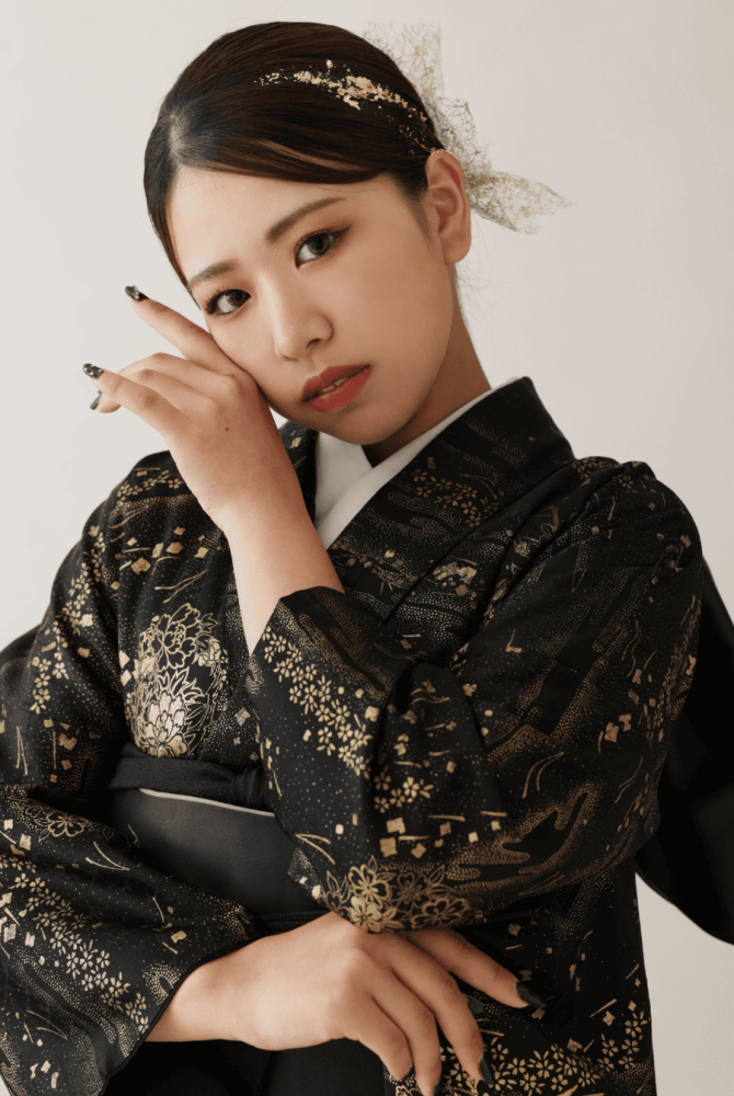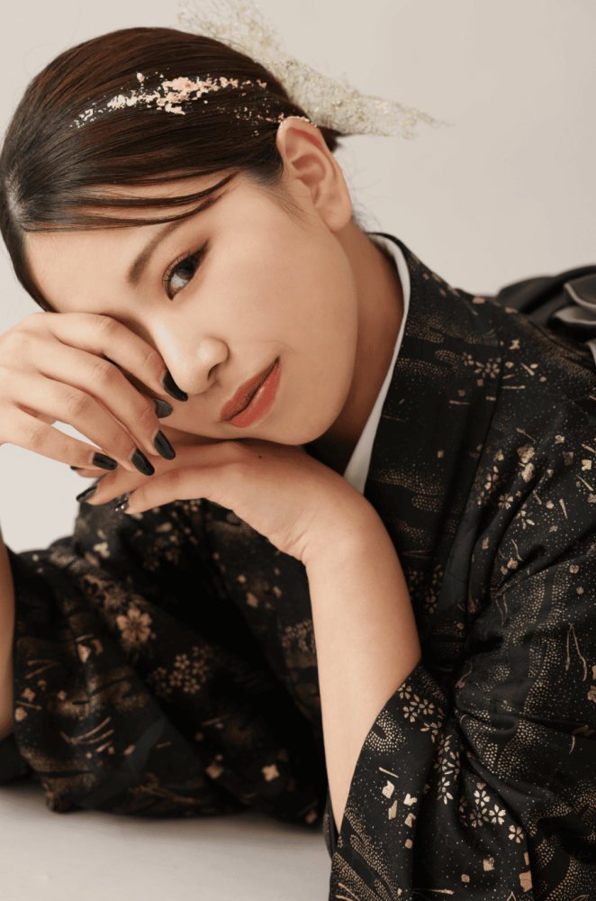 モードな指先: 振袖と合わせたブラックネイルが、顔周りのポージングをよりドラマチックに引き締めます。